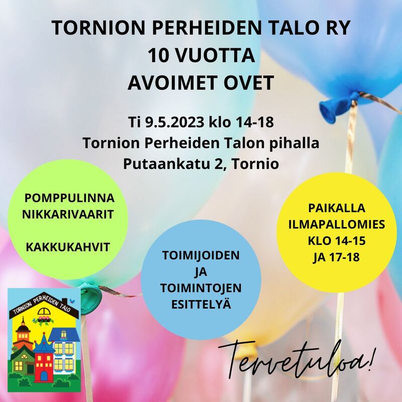 Tornion Perheiden Talo ry:n 10 v juhla ja Avoimet ovet klo 14 - 18 Putaankatu 2 pihapiirissä Ohjelma: - toimijoiden ja toimintojen esittelyteltta - ilmapallomies paikalla klo 14 - 15 ja 17 - 18 - nikkarivaarit nikkaroimassa lasten kanssa - pomppulinna ja liukumäki - kakkukahvitarjoilu TERVETULOA ! |